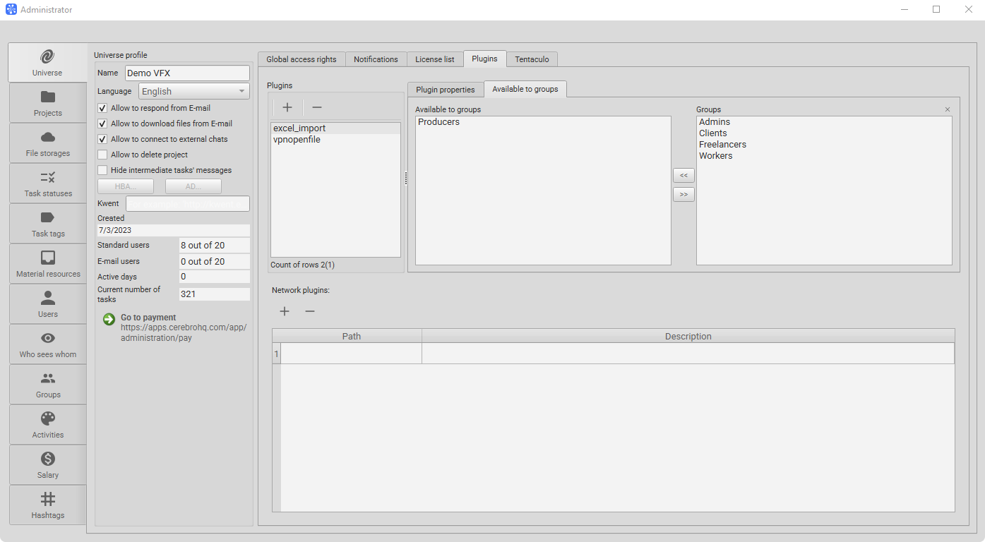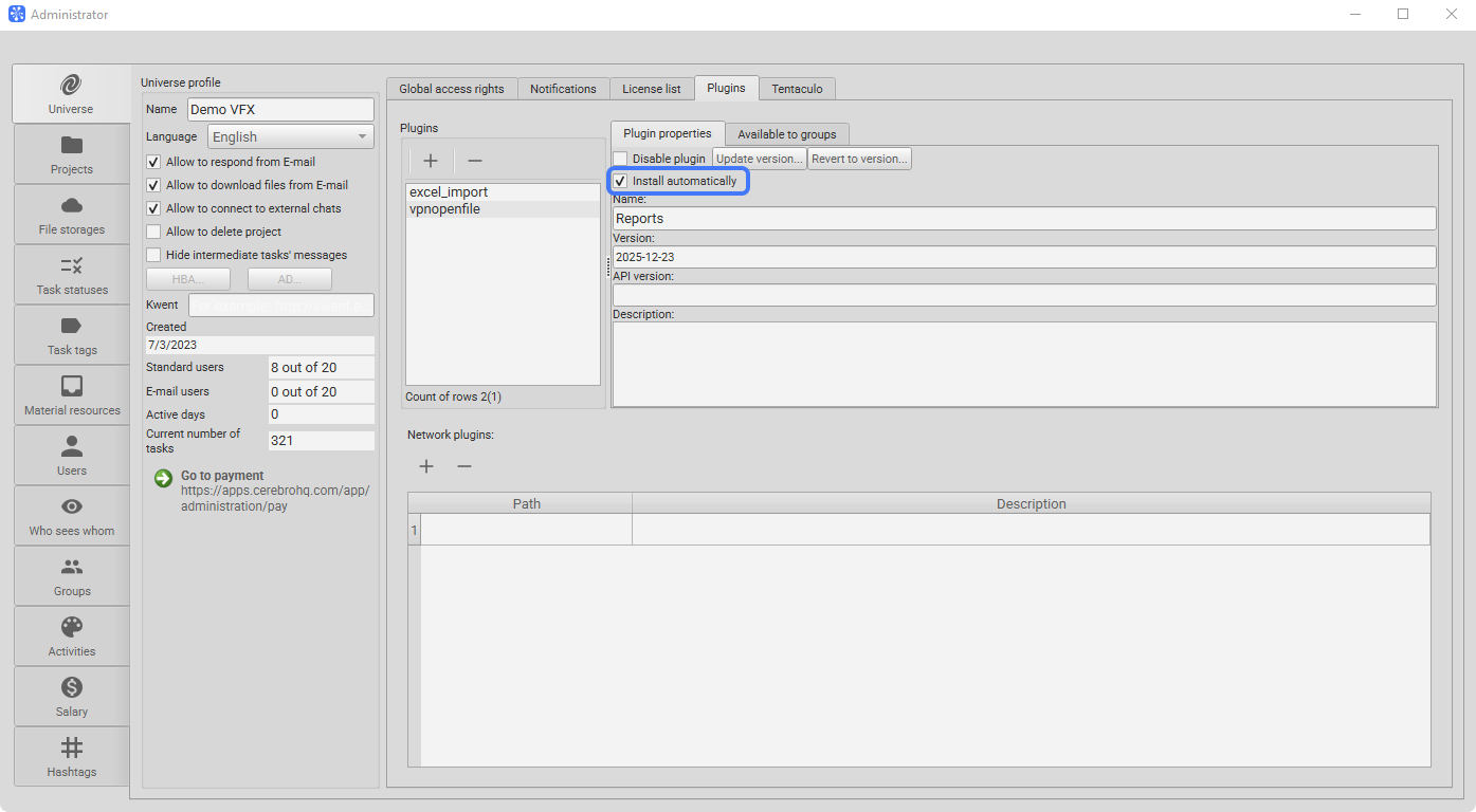 (окно Администратор — вкладка Вселенная — раздел Плагины).